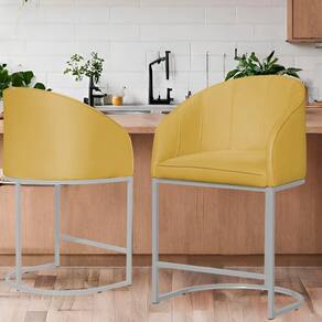 Kit 02 Poltronas Banqueta Mia Estofada Tecido Em Suede Base Metal Branco - Estopar - Amarelo