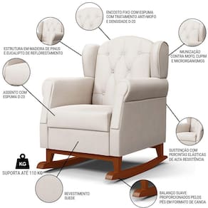 O Kit 02 Poltronas de Amamentação Base de Madeira Balanço Lucy P04 Suede Bege - Mpozenato é a escolha ideal para as mamães que buscam conforto, beleza e qualidade. Ela possui uma estrutura de madeira de reflorestamento com imunização contra mofo, cupim e microrganismos, garantindo maior durabilidade e resistência. A sustentação do assento e encosto é feita com percintas elásticas que proporcionam mais maciez e ergonomia. A base canoa com balanço permite um movimento suave e relaxante, ideal para ninar o bebê ou descansar após um dia cansativo. A poltrona tem um design moderno e elegante que combina com qualquer ambiente. Ela está disponível em várias cores para você escolher a que mais combina com o seu estilo. Não perca essa oportunidade de ter uma Poltrona de Amamentação e Descanso na sua casa. Você vai se surpreender com o conforto e a qualidade dessa poltrona. Compre já!