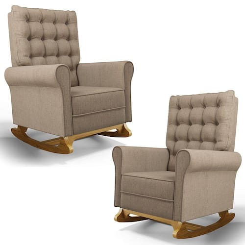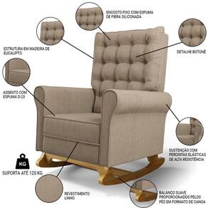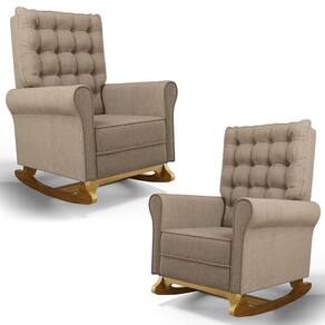 As Poltronas de Balanço são feitas com materiais de alta qualidade, estrutura em madeira de eucalipto, o tecido linho macio e resistente, e a espuma D23 a densidade ideal para o seu conforto, base em madeira com um lindo design e balanço suave, que ajuda a relaxar e a embalar o sono do seu bebê. Além disso, o Kit 2 Poltronas possui um design moderno e sofisticado, com detalhes em botonê revestido no encosto, que dão um toque de charme e elegância ao ambiente.