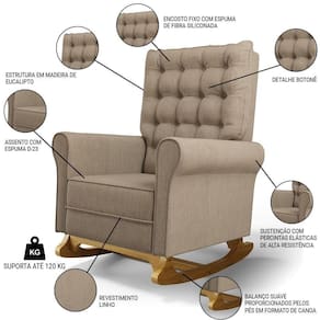 As Poltronas de Balanço são feitas com materiais de alta qualidade, estrutura em madeira de eucalipto, o tecido linho macio e resistente, e a espuma D23 a densidade ideal para o seu conforto, base em madeira com um lindo design e balanço suave, que ajuda a relaxar e a embalar o sono do seu bebê. Além disso, o Kit 2 Poltronas possui um design moderno e sofisticado, com detalhes em botonê revestido no encosto, que dão um toque de charme e elegância ao ambiente.