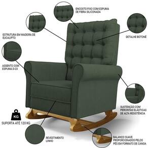 AssemblyRequired: Sim, sugerimos a contratação do nosso de montagem (para os CEPs em que o está dispon | OriginState: PR | ProductHeight: 105 | ProductWidth: 70 | Profundidade: 77 cm | Requere montagem: Sim | SupplierSimpleName: Kit 02 Poltronas de Amamentação e Descanso Base Madeira Balanço Brenda G05 Linho Verde - Mpozenato | ProductInstructions: Produto para uso em ambiente interno, nao devendo ficar exposto ao sol, calor e umidade excessivos. | ColorSimple: Verde | Cor: Verde | ColorSupplier: Verde | Altura: 105 cm | ColorFamily: Verde | Color: Verde | Gênero: Unissex | Largura: 70 cm | Origem: | ProductWarranty: 90 dias após o do produto | ProductLength: 77 | ProductWeight: 50 | Model: Brenda | Material: Madeira de Eucalipto | ProductContents: 2 Poltronas | OriginCountry: | SizeDescription: 105 x 70 x 77 cm | MaterialFamily: Madeira | Peso: 50 kg | Manual: Sim