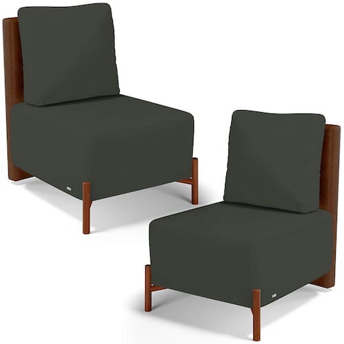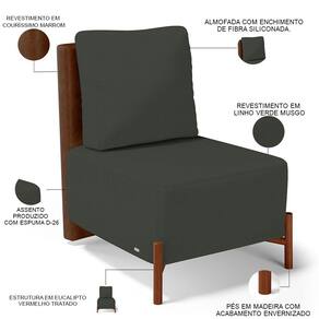 Revestimento do encosto em Couríssimo na cor Marrom do assento em Linho na cor Verde Musgo, de alta qualidade.