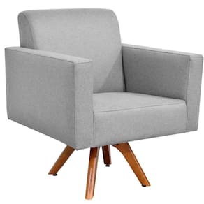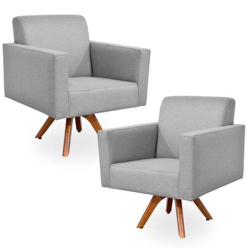 Características: Estrutura em madeira de reflorestamento de eucalipto, pinus e MDF. Revestimento Linho Cinza Escuro. Design inovador. Assento Fixo com espuma D-26 Sobre Percintas elásticas. Encosto Fixo com espuma D-23 Sobre Percintas elásticas. Braço com espuma D-26. Percinta elástica 50mm. Peso suportado: Até 120 kg. Base giratória de madeira reforçado de 4 cm.