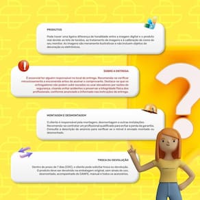 Limpeza e cuidados: Utilizar pano levemente umedecido com água, seguido de pano seco. Não utilizar produtos químicos ou abrasivos na limpeza. Evitar contato com objetos cortantes. Manter ao abrigo de local interno, sem ficar exposto diretamente ao sol, calor e umidade excessivo.