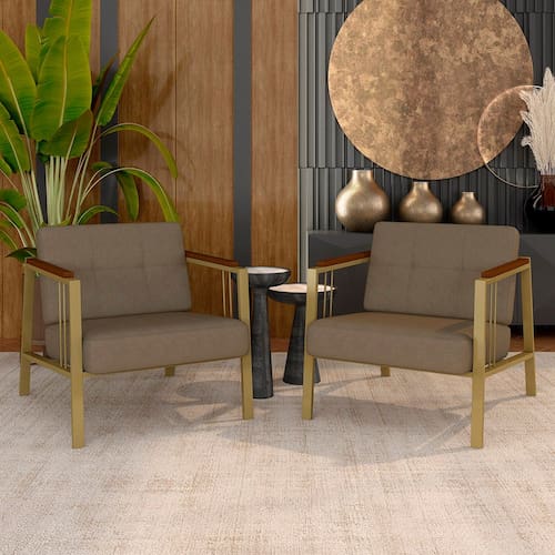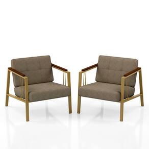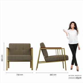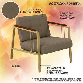 Detalhes Técnicos das Poltronas - Assento e Encosto Tapeçados, Estofados e Fixos - Espuma do Assento e do Encosto: D20 - Tonalidade Estrutura: Dourado -Tonalidade Estofado: Suede Capuccino - Material: Metalon - Medida Poltrona: A:80CM x L:73CM x P:88CM - Medida Altura do Assento ao chão: 42,10 cm - Poltrona suporta até 120KG