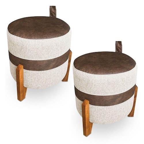 Kit 02 Puffs Le Mans Linho Bege E Corano Nozes Base De Madeira - Pallazio