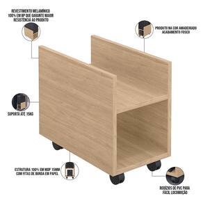 Características: Estrutura 100% em MDP 15mm. Fitas com borda de papel. Revestimento melamínico 100% em BP, que garante maior resistência ao produto. 04 rodízios de PVC para fácil locomoção. Suporta até 15Kg. Prateleira com largura de 19cm. Produto na Cor Amadeirado, com acabamento Fosco.