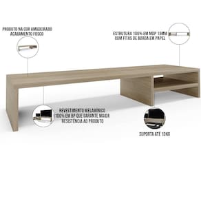 Organização, praticidade e são qualidades que definem o Suporte Para Monitor Stand Home Office Lap L03 Amadeirado - Lyam! Vem com a proposta de auxiliar você em suas horas de trabalho, estudos ou entretenimento em frente ao , pois ajuda a manter a tela na altura dos olhos, evitando dores na coluna e pescoço, garantindo uma melhor postura. Com acabamento impecável, possui revestimento melamínico que assegura maior resistência ao produto. Conta ainda com uma prateleira para que seus pertences mais importantes estejam sempre à mão e de fácil acesso, sua pegada Slim também merece destaque, por trazer modernidade ao ambiente e conversar super bem com a decoração. Não perca tempo e aproveite! Dimensões do produto (L x A x P) 89 x 15 x 25 cm Características: Estrutura 100% em MDP 15mm. Produto na cor Amadeirada, com acabamento Fosco. Fitas com borda de papel. Revestimento melamínico 100% em BP, que garante maior resistência ao produto. Suporta até 10Kg. Observações importante: - Produto entregue desmontado, acompanha manual de montagem. - Montagem com cavilhas e parafusos zincados. - A limpeza deve ser feita com pano levemente umedecido em água limpa, sem esfregar, não utilizar produtos abrasivos, desengordurantes, álcool ou solvente. - Produto para uso residencial em ambiente interno, não devendo ficar exposto diretamente ao sol, calor e umidade excessivos. - Pode haver alguma diferença de tonalidade entre a imagem e o produto real, por conta do tratamento de imagens e a calibração de cores do seu monitor. - As imagens são meramente ilustrativas, não acompanham objetos de decoração e eletrônicos. - Ao receber a mercadoria, o cliente deve verificar as condições da embalagem, caso haja alguma não assine o de e com nossa para orientações. - Montagem, desmontagem e outras instalações serão de responsabilidade do cliente. Não nos responsabilizamos, no ato da , por subir escadas/elevadores ou pelo por guincho em apartamentos. Eventuais despesas são de responsabilidade do comprador. - Confira as dimensões do produto e certifique-se de que passará normalmente por supostos elevadores, portas, escadas e/ou corredores de sua residência. Color: Madeira | ColorFamily: Madeira | ColorSimple: Madeira | ColorSupplier: Madeira | Material: MDP | MaterialFamily: MDP | Model: Lap | OriginCountry: | OriginState: PR | ProductContents: 02 Suportes para Monitor | ProductHeight: 15 cm | ProductInstructions: Produto para uso em ambiente interno, nao devendo ficar exposto ao sol, calor e umidade excessivos. | ProductLength: 25 cm | ProductWarranty: 90 dias após o do produto | ProductWeight: 10 kg | ProductWidth: 90 cm | SizeDescription: Altura: 15 cm Largura: 90 cm Profundidade: 25 cm | SupplierSimpleName: Kit 02 Suportes Para Monitor Stand Home Office Lap 90 cm L03 Amadeirado - Lyam