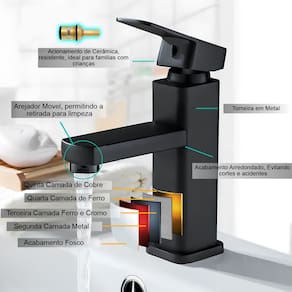 - Altura Total do Produto: 17 cm - Largura: 4 cm - Profundidade: 16 cm - Mecanismo | registro: ¼ de volta - Peso: 0.641 kg - Material Do Corpo: Aço Inoxidável - Pressão Mínima Para Funcionamento: MCA 4 - Pressão Máxima Para Funcionamento: MCA 40 - Vazão Mínima Para Funcionamento (L/min): 4 - Vazão Máxima Para Funcionamento (L/min): 13 - Arejador (Bica Fixa): Com Arejador Embutido - Acabamento: Preto Fosco - Área Indicada: Banheiro | Bancada | Mesa