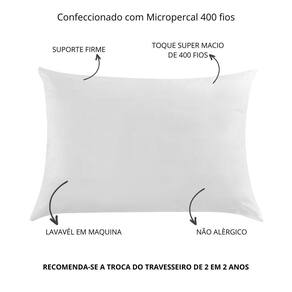 Composição: Tecido: 100% poliéster - micro percal 400 fios Enchimento: 100% poliéster Possível lavar e secar em máquina Cuide da sua saúde e do seu bem-estar trocando seu travesseiro a cada 2 anos. Para maior durabilidade, afofe seu travesseiro diariamente. Atenção: foto ilustrativa