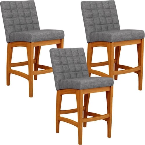 ndo muita excelência, o Kit 03 Banquetas Baixa Para Cozinha Bancada Bar Sala De Jantar 90 cm Fixa Mila L02 Linho Cinza Escuro - Lyam Decor é o complemento que faltava para deixar sua casa ainda mais extraordinária. Seu encosto com costura em padrão quadriculado e assento estofados, centralizam em si uma graciosidade estonteante, sem perder todo o seu conforto. A estrutura em madeira, na cor nozes, também é digna de notoriedade, por imprimir bastante personalidade a sua decoração. Vale ressaltar ainda, o apoio para os pés que garante maior à mesma.