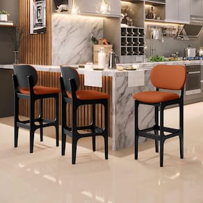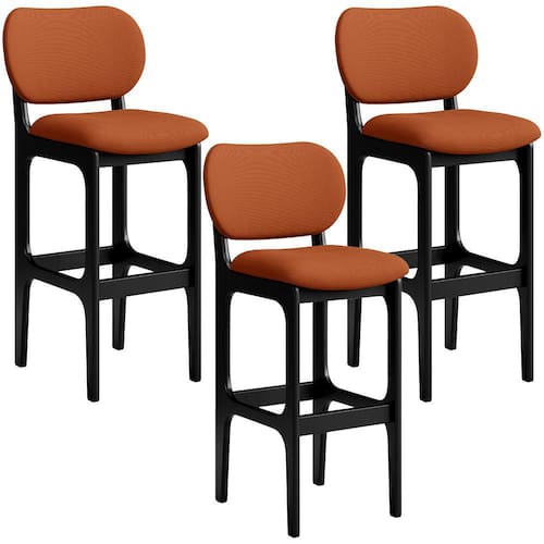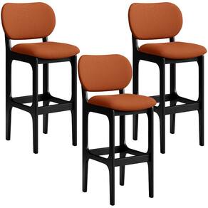 Amplamente sofisticada, o Kit 03 Banquetas Alta Bar Cozinha Sala Jantar Fixa Betta L02 Preto Tecido Terracota - Lyam Decor irá agregar ainda mais valor em sua decoração!! Sendo capaz de compor muito bem o ambiente, é produzida com materiais de excelente qualidade, a resistente estrutura em madeira de Taeda, na cor preto, conta com apoio para os pés (que garante maior segurança), além do assento e encosto estofados super confortáveis e convidativos, que são revestidos em tecido terracota, extremamente elegante.