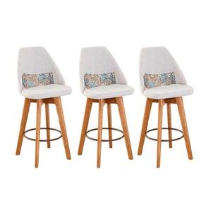Kit 03 Banquetas Alta Maya Giratória Com Encosto Linho Bege Claro e Almofada Folhas - Aurora Line - Blush