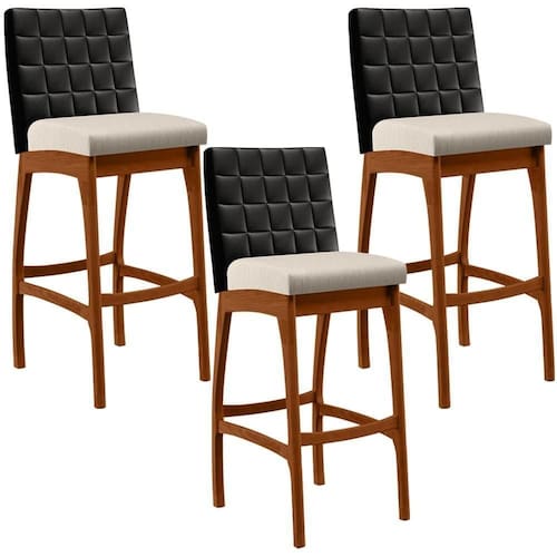 ndo muita excelência, o Kit 03 Banquetas Altas Cozinha Sala De Jantar Fixa Mila B04 Couríssimo Preto Linho Cru - Lyam Decor é o complemento que faltava para deixar sua casa ainda mais extraordinária. Seu encosto com costura em padrão quadriculado e assento estofados, centralizam em si uma graciosidade estonteante, sem perder todo o conforto. A estrutura em madeira, na cor nozes, também é digna de notoriedade, por imprimir bastante personalidade a sua decoração. Vale ressaltar ainda, o apoio para os pés que garante maior à banqueta.