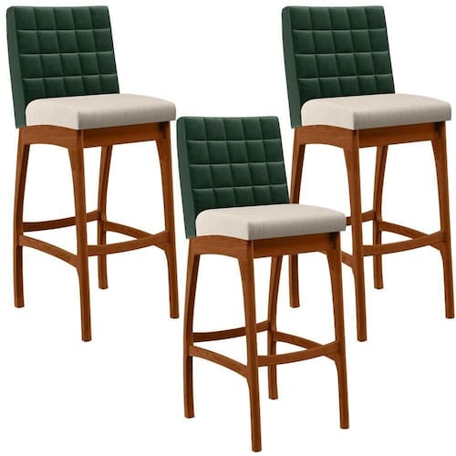 ndo muita excelência, o Kit 03 Banquetas Altas Cozinha Sala De Jantar Fixa Mila B04 Facto Verde Musgo Linho Cru - Lyam Decor é o complemento que faltava para deixar sua casa ainda mais extraordinária. Seu encosto com costura em padrão quadriculado e assento estofados, centralizam em si uma graciosidade estonteante, sem perder todo o conforto. A estrutura em madeira, na cor nozes, também é digna de notoriedade, por imprimir bastante personalidade a sua decoração. Vale ressaltar ainda, o apoio para os pés que garante maior à banqueta.