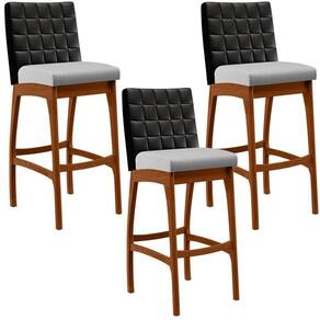 ndo muita excelência, o Kit 03 Banquetas Altas Cozinha Sala Jantar Fixa Mila B04 Couríssimo Preto Linho Cinza - Lyam Decor é o complemento que faltava para deixar sua casa ainda mais extraordinária. Seu encosto com costura em padrão quadriculado e assento estofados, centralizam em si uma graciosidade estonteante, sem perder todo o conforto. A estrutura em madeira, na cor nozes, também é digna de notoriedade, por imprimir bastante personalidade a sua decoração. Vale ressaltar ainda, o apoio para os pés que garante maior à banqueta.