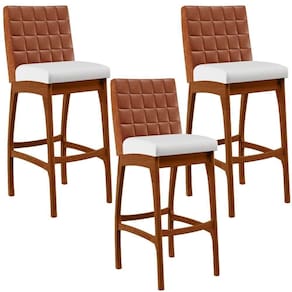 ndo muita excelência, o Kit 03 Banquetas Altas Cozinha Sala Jantar Fixa Mila B04 Couríssimo Camel Corano Branco - Lyam Decor é o complemento que faltava para deixar sua casa ainda mais extraordinária. Seu encosto com costura em padrão quadriculado e assento estofados, centralizam em si uma graciosidade estonteante, sem perder todo o conforto. A estrutura em madeira, na cor nozes, também é digna de notoriedade, por imprimir bastante personalidade a sua decoração. Vale ressaltar ainda, o apoio para os pés que garante maior segurança à banqueta.