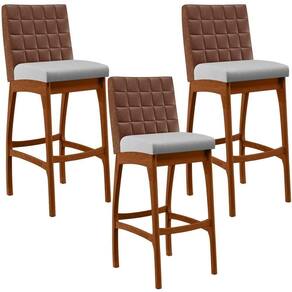 ndo muita excelência, o Kit 03 Banquetas Altas Cozinha Sala Jantar Fixa Mila B04 Couríssimo Marrom Linho Cinza - Lyam Decor é o complemento que faltava para deixar sua casa ainda mais extraordinária. Seu encosto com costura em padrão quadriculado e assento estofados, centralizam em si uma graciosidade estonteante, sem perder todo o conforto. A estrutura em madeira, na cor nozes, também é digna de notoriedade, por imprimir bastante personalidade a sua decoração. Vale ressaltar ainda, o apoio para os pés que garante maior segurança à banqueta.