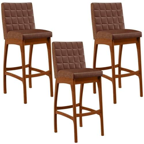 ndo muita excelência, o Kit 03 Banquetas Altas Para Cozinha Sala De Jantar Fixa Mila B04 Couríssimo Marrom - Lyam Decor é o complemento que faltava para deixar sua casa ainda mais extraordinária. Seu encosto com costura em padrão quadriculado e assento estofados, centralizam em si uma graciosidade estonteante, sem perder todo o conforto. A estrutura em madeira, na cor nozes, também é digna de notoriedade, por imprimir bastante personalidade a sua decoração. Vale ressaltar ainda, o apoio para os pés que garante maior à banqueta.