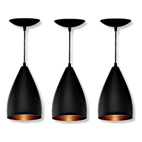 Características: - kit 3 pendentes vegas preto textura / bronze - pendente em alumínio - pintura de altíssima qualidade - o melhor acabamento do mercado - luminária com acabamento de teto individual, fabricada em alumínio, material altamente resistente ao tempo, 100% alumínio não enferruja - composta por cabo pp com tamanho ajustável, soquete e-27 - acabamento de teto individual de 12cm. - ideal para bancadas, ambientes como cozinha, área gourmet, sala de jantar, bares, etc...
