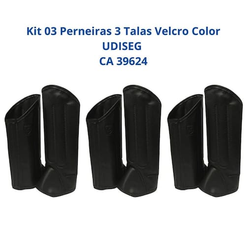 Kit 03 Perneiras 3 Talas fecho aderente Color UDISEG CA 39624 A perneira é confeccionada em duas camadas de material sintético reforçado, com três talas de polipropileno soldadas eletronicamente e fechamento em fecho aderente, oferecendo proteção completa dos membros inferiores contra cortes, perfurações, escoriações e picadas de animais peçonhentos, inclui proteção de metatarso que se sobrepõe ao peito do pé.
