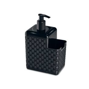 O dispenser armazena cerca de 600ml de detergente com bico dosador que evita disperdício e o porta esponja tem base com furos que facilita o escoamento da água.