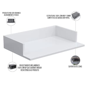 Características: Estrutura 100% em MDP 15mm. Fitas com borda de papel. Revestimento melamínico 100% em BP, que garante maior resistência ao produto. Suporta até 20Kg. Produto na Cor Branco, com acabamento Fosco.