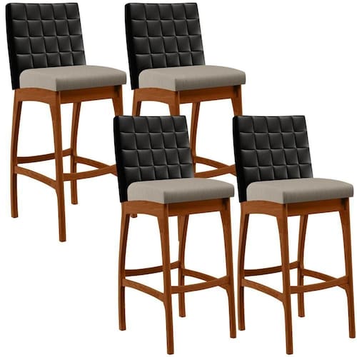 ndo muita excelência, o Kit 04 Banquetas Altas Cozinha Sala De Jantar Fixa Mila B04 Couríssimo Preto Linho Bege - Lyam Decor é o complemento que faltava para deixar sua casa ainda mais extraordinária. Seu encosto com costura em padrão quadriculado e assento estofados, centralizam em si uma graciosidade estonteante, sem perder todo o conforto. A estrutura em madeira, na cor nozes, também é digna de notoriedade, por imprimir bastante personalidade a sua decoração. Vale ressaltar ainda, o apoio para os pés que garante maior à banqueta.
