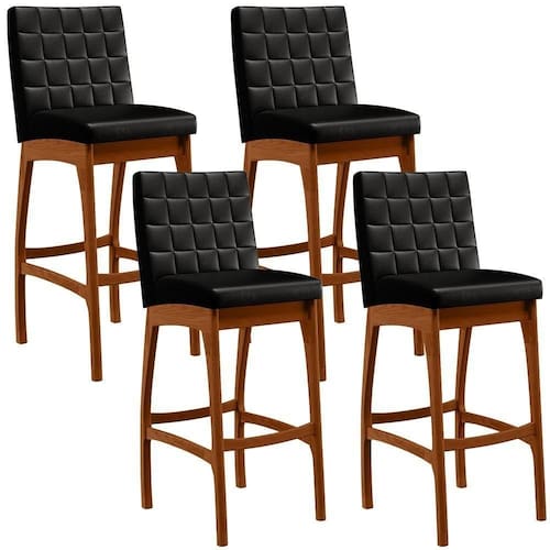 Entregando muita excelência, a Kit 04 Banquetas Altas Para Cozinha Sala de Jantar Fixa Mila B04 Couríssimo Preto - Lyam Decor é o complemento que faltava para deixar sua casa ainda mais extraordinária. Seu encosto com costura em padrão quadriculado e assento estofados, centralizam em si uma graciosidade estonteante, sem perder todo o seu conforto. A estrutura em madeira, na cor nozes, também é digna de notoriedade, por imprimir bastante personalidade a sua decoração. Vale ressaltar ainda, o apoio para os pés que garante maior segurança à mesma.
