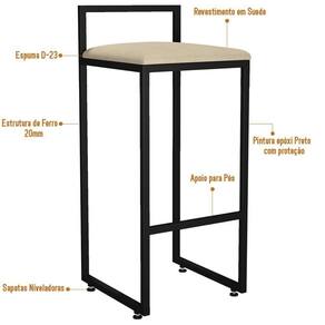 Kit 04 Banquetas Altas Para Cozinha Sala De Jantar Hanna L02 Preto Suede Bege - Lyam Decor O seu sonho é ter uma cozinha integrada? Uma banqueta pode ser fator determinante para ajudar nesta tarefa, principalmente se você contar com o modelo Kit 04 Banquetas Altas Para Cozinha Sala de Jantar Hanna Suede Bege - Lyam Decor. Ideal para quem deseja montar uma cozinha americana ou agregar valor à sua área gourmet, o modelo possui design slim que é super apropriado para apartamentos ou para quem tem uma cozinha compacta. Outro ponto positivo é que este modelo não possui braços, sendo assim ocupa menos espaço e torna melhor para circulação. Ah, também possui apoio para os pés, elemento fundamental para a ergonomia e conforto. As opções de são infinitas, seja para um living, recepção, hall de entrada, sala de jantar, área gourmet ou ambiente corporativo. Para ter um espaço vital procure a distância mínima de 50 cm entre as banquetas. Desta forma a organização ficará harmônica e muito confortável para utilização. Dimensões do produto (A x L x P) 81 x 35 x 36 cm Altura do assento ao chão: 66 cm Características: Estrutura de Ferro com espessura de 20mm. Acabamento em pintura eletrostática cor Preto. Estrutura do assento em Madeira de Eucalipto. Assento fixo com espuma certificada D-23. Revestimento em Suede. Sapatas Niveladoras. Peso suportado: Até 150 kg. - Por se tratar de estofado as medidas podem ter uma pequena variação de até 3 cm. - A tonalidade do produto real poderá ter ligeira variação devido o lote de tecidos. Observações importantes: - Produto para residencial em ambiente interno, não devendo ficar exposto diretamente ao sol, calor e umidade excessivos. - Pode haver alguma diferença de tonalidade entre a imagem e o produto real, por conta do tratamento de imagens e a calibração de cores do seu monitor. - As imagens são meramente ilustrativas, não acompanham objetos de decoração e eletrônicos. - Ao receber a mercadoria, o cliente deve verificar as condições da embalagem, caso haja alguma não assine o comprovante de recebimento. - Montagem, desmontagem e outras instalações serão de responsabilidade do cliente. Não nos responsabilizamos, no ato da , por subir escadas/elevadores ou pelo transporte por guincho em apartamentos. Eventuais despesas são de responsabilidade do comprador. - Confira as dimensões do produto e certifique-se de que passará normalmente por supostos elevadores, portas, escadas e/ou corredores de sua residência. Altura Montado: 81 | Largura Montado: 35 | Profundidade Montado: 36
