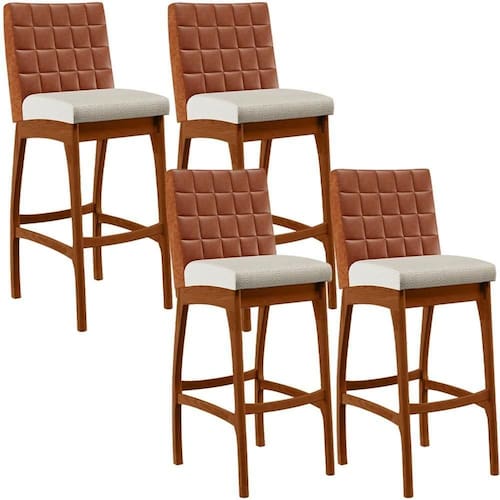ndo muita excelência, o Kit 04 Banquetas Altas Sala De Jantar Fixa Mila B04 Couríssimo Camel Linho Champagne - Lyam Decor é o complemento que faltava para deixar sua casa ainda mais extraordinária. Seu encosto com costura em padrão quadriculado e assento estofados, centralizam em si uma graciosidade estonteante, sem perder todo o conforto. A estrutura em madeira, na cor nozes, também é digna de notoriedade, por imprimir bastante personalidade a sua decoração. Vale ressaltar ainda, o apoio para os pés que garante maior à banqueta.