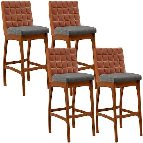 ndo muita excelência, o Kit 04 Banquetas Altas Sala De Jantar Fixa Mila B04 Couríssimo Camel Linho Cinza Escuro - Lyam Decor é o complemento que faltava para deixar sua casa ainda mais extraordinária. Seu encosto com costura em padrão quadriculado e assento estofados, centralizam em si uma graciosidade estonteante, sem perder todo o conforto. A estrutura em madeira, na cor nozes, também é digna de notoriedade, por imprimir bastante personalidade a sua decoração. Vale ressaltar ainda, o apoio para os pés que garante maior à banqueta.