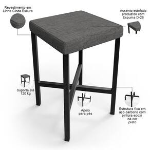 Color: Cinza | ColorFamily: Cinza | ColorSimple: Cinza | ColorSupplier: Cinza | Material: Estrutura de aço carbono, Revestimento em Linho e espuma | MaterialFamily: Aço carbono, linho espuma | Model: Stella | OriginCountry: Nacional | OriginState: PR | ProductContents: 04 Banquetas | ProductHeight: 98 cm | ProductInstructions: Produto para uso em ambiente interno, nao devendo ficar exposto ao sol, calor e umidade excessivos. | ProductLength: 37 cm | ProductWarranty: 90 dias após o recebimento do produto | ProductWeight: 16 kg | ProductWidth: 39 cm | SizeDescription: Altura: 98 cm x Largura: 39 cm x Profundidade: 37 cm | SupplierSimpleName: Kit 04 Banquetas Baixa Bar Cozinha Sala De Jantar Preto Stella L02 Linho Cinza Escuro - Lyam Decor