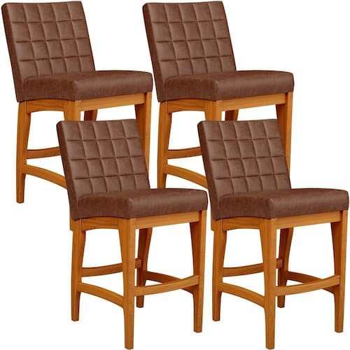 ndo muita excelência, o Kit 04 Banquetas Baixas Para Cozinha Bancada Bar Sala De Jantar 90 cm Fixa Mila L02 Couríssimo Marrom - Lyam Decor é o complemento que faltava para deixar sua casa ainda mais extraordinária. Seu encosto com costura em padrão quadriculado e assento estofados, centralizam em si uma graciosidade estonteante, sem perder todo o seu conforto. A estrutura em madeira, na cor nozes, também é digna de notoriedade, por imprimir bastante personalidade a sua decoração. Vale ressaltar ainda, o apoio para os pés que garante maior à mesma.