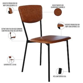 Color: Caramelo | ColorFamily: Caramelo | ColorSimple: Caramelo | ColorSupplier: Caramelo | Material: Estrutura em Aço, MDP, Revestimento em Couro sintético e espuma | MaterialFamily: Aço, MDP, Couro sintético e espuma | Model: Village | OriginCountry: Brasil | OriginState: PR | ProductContents: 04 Cadeiras | ProductHeight: 249 cm | ProductInstructions: Produto para uso em ambiente interno, nao devendo ficar exposto ao sol, calor e umidade excessivos. | ProductLength: 53 cm | ProductWarranty: 90 dias após o recebimento do produto | ProductWeight: 26 kg | ProductWidth: 43 cm | SizeDescription: Altura: 249 cm x Largura: 43 cm x Profundidade: 53cm | SupplierSimpleName: Kit 04 Cadeira Para Sala de Jantar Village Preto C01 Courino Caramelo - Lyam Decor