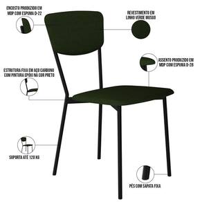 Color: Verde | ColorFamily: Verde | ColorSimple: Verde | ColorSupplier: Verde Musgo | Material: Estrutura em Aço, MDP, Revestimento em Linho e espuma | MaterialFamily: Aço, MDP, Linho e espuma | Model: Village | OriginCountry: Brasil | OriginState: PR | ProductContents: 04 Cadeiras | ProductHeight: 249 cm | ProductInstructions: Produto para uso em ambiente interno, nao devendo ficar exposto ao sol, calor e umidade excessivos. | ProductLength: 53 cm | ProductWarranty: 90 dias após o recebimento do produto | ProductWeight: 26 kg | ProductWidth: 43 cm | SizeDescription: Altura: 249 cm x Largura: 43 cm x Profundidade: 53cm | SupplierSimpleName: Kit 04 Cadeira Para Sala de Jantar Village Preto C01 Linho Verde Musgo - Lyam Decor