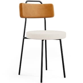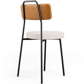 Revestimento do encosto em Couríssimo na cor Whisky e do assento em Linho na cor Cru, com acabamento semi brilho.