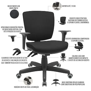 Possui alavancas de regulagem de altura do assento e inclinação do encosto.