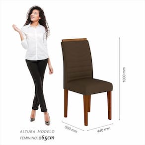 Detalhes Técnicos da Cadeira - Assento e Encosto Tapeçados, Estofados e Fixos - Peso Suportado da Cadeira: 90KG - Facilidade da Montagem: Média - Tonalidade da Cadeira: Cinamomo/Suede Marrom - Espuma do Assento: D16 - Espuma do Encosto: D14 - Tipo de Pintura: UV Texturizada -Material: Estrutura em MDF / Pés e Espaldar Madeira - Medida da Cadeira: 100CM x 44CM x 50CM