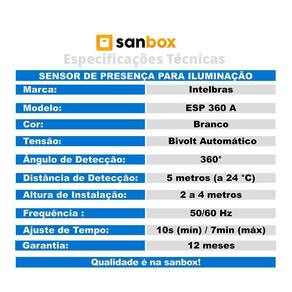 O Kit 04 Sensores De Presença De Sobrepor Para Iluminação Intelbras ESP 360 A oferece total conforto para aqueles que estão cansados de acender e apagar lâmpadas manualmente Prático e Moderno, o ESP 360 é utilizado para o acionamento automático de lâmpadas em ambientes comercias e residências, esse equipamento detecta a movimentação de corpos quentes, de pessoas e até mesmo de animais, por meio do sensor infravermelho que reconhece as fontes de calor. Você não precisa mais acionar o para acender ou apagar lâmpadas O sensor ESP 360 A detecta a presença e envia automaticamente o comando para a lâmpada acender. E após um tempo pré-determinado sem detectar presença, o sensor envia outro comando para a lâmpada apagar. Com a função fotocélula você pode determinar se o sensor vai atuar 24h por dia ou apenas durante a noite para economizar energia. Além disso, o ESP 360 A permite que você ajuste o tempo de 10 segundos mínimo a 7 minutos máximo para que a lâmpada seja apagada, após o equipamento não detectar mais nenhum movimento nesse intervalo. Esse sensor deve ser instalado em uma altura mínima de 2 e máxima de 4 metros. Ele possui um ângulo de detecção de 360 com um alcance de até 5 metros. Além disso, por ser articulado, você pode direcionar o sensor para cobrir a área que você precisa. Especificações Técnicas: -marca: Intelbras -modelo: ESP 360 A -quantidades: quatro -cor: Branco -tensão: Bivolt automático 100 a 240 Vac -frequência da Rede Elétrica: 50/60 Hz -distância Máxima de Detecção: 5 metros a 24 C -ângulo de Detecção: 360 -altura de Instalação: 2 a 4 metros -temperatura de Operação: 0 a 40 C -ajuste de Tempo: 10s mínimo / 7min máximo -ajuste de Luminosidade Fotocélula : Menor que 10 até 2000 lux -potência Máxima 110 Vac : 800W Lâmpada Incandescente -potência Máxima 110 Vac : 200W Lâmpada Econômica -potência Máxima 220 Vac : 1200W Lâmpada Incandescente -potência Máxima 220 Vac : 300W Lâmpada Econômica -tipos de Lâmpadas: Incandescente e Econômicas LED e Fluorescentes Compactas -grau de Proteção: IP20 em Ambientes Internos -dimensões do Sensor L x A : 12 x 2,8cm -peso do Sensor: 0,110 Kg Itens inclusos: -04 Sensores de Presença Para Iluminação -01 Manual : - de Fábrica: 12 Meses