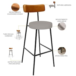 Amplamente moderna, dispondo de muito realce e design singular, o Kit 05 Banquetas Alta Cozinha Sala De Jantar Aço Milão L02 Couríssimo Whisky Linho Bege - Lyam Decor vem com a personalidade e elegância que sua decoração merece! Estruturada em aço carbono, contrasta lindamente com o encosto e assento estofados, cabe mencionar ainda o revestimento do seu encosto em Couríssimo e do assento em Linho, é confeccionada por materiais de excelente qualidade, extremamente resistentes e aconchegantes.