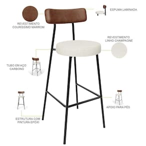 Kit 05 Banquetas Alta Cozinha Sala Jantar Milão L02 Couríssimo Marrom Linho Champagne - Lyam Decor - Preto