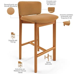 ProductHeight: 83 cm | Model: Banqueta Dara | Color: Mostarda | SupplierSimpleName: Kit 05 Banquetas Alta Para Cozinha Sala de Jantar Bar Dara L05 Bouclê Mostarda - Lyam Decor | ProductWeight: 50 kg | É dobrável: Não | Com espaço de armazenamento: Não | Cor da estrutura da cadeira: Castanho | Profundidade da cadeira: 47 cm | Largura da cadeira: 47 cm | OriginState: PR | OriginCountry: | ProductWidth: 47 cm | SizeDescription: Altura: 83cm x Largura: 47cm x Profundidade: 47cm | Material do estofamento: Bouclê | Com rodas: Não | Cor do assento: Mostarda | Fabricante: Lyam Decor | Cor: Mostarda | ProductContents: 05 Banquetas | MaterialFamily: Madeira e Espuma | Diâmetro: na | Tipo de produto: Banqueta | ProductLength: 47 cm | Material: Madeira e Espuma | Estilo: Clássico | ProductWarranty: 90 dias após o do produto | ProductInstructions: Produto para uso residencial em ambiente interno, não devendo ficar exposto diretamente ao sol, calo | Com estofado: Sim | Peso máximo suportado: 150 Kg | Quantidade de Caixas de embalagem: 1 | Altura da cadeira: 83 cm | Com apoio de braços: Não | Requer montagem: Não | Largura do assento: 45 cm | Largura: 47 cm | Peso: 50 kg | É empilhável: Não | É cadeira de balanço: Não | Altura do assento a partir do solo: 74 cm | Cor do estofamento: Mostarda | Profundidade do assento: 37 cm | Desenho do tecido: Liso | Espessura do assento: na