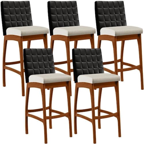 ndo muita excelência, o Kit 05 Banquetas Altas Sala De Jantar Fixa Mila B04 Couríssimo Preto Linho Champagne - Lyam Decor é o complemento que faltava para deixar sua casa ainda mais extraordinária. Seu encosto com costura em padrão quadriculado e assento estofados, centralizam em si uma graciosidade estonteante, sem perder todo o conforto. A estrutura em madeira, na cor nozes, também é digna de notoriedade, por imprimir bastante personalidade a sua decoração. Vale ressaltar ainda, o apoio para os pés que garante maior à banqueta.