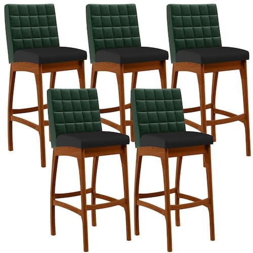 ndo muita excelência, o Kit 05 Banquetas Altas Cozinha Sala Jantar Fixa Mila B04 Facto Verde Musgo Corano Preto - Lyam Decor é o complemento que faltava para deixar sua casa ainda mais extraordinária. Seu encosto com costura em padrão quadriculado e assento estofados, centralizam em si uma graciosidade estonteante, sem perder todo o conforto. A estrutura em madeira, na cor nozes, também é digna de notoriedade, por imprimir bastante personalidade a sua decoração. Vale ressaltar ainda, o apoio para os pés que garante maior segurança à banqueta.