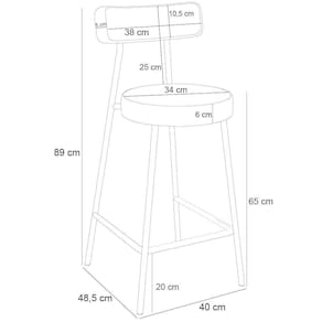 Medidas Internas: Altura do chão ao assento: 65 cm Altura do chão ao apoio para pés: 20 cm Altura do assento ao encosto: 20 cm Altura do assento: 6 cm Largura do assento: 35 cm Largura do encosto: 38 cm Profundidade do encosto: 4,5 cm