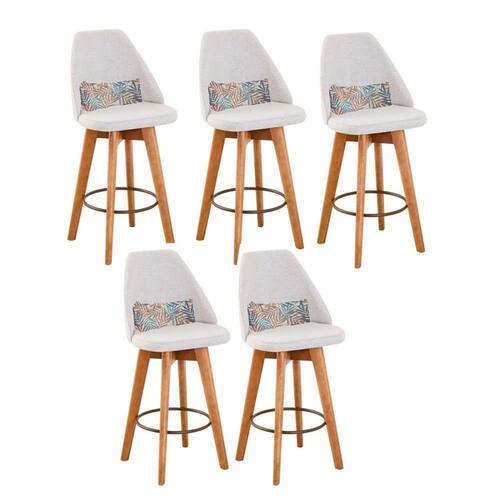 Kit 05 Banquetas Alta Maya Giratória Com Encosto Linho Bege Claro E Almofada Folhas - Gat Magazine Banqueta Maya Giratória - GAT MAGAZINE A Banqueta Maya possui assento e pés em madeira eucalipto com sistema giratório! Os pés contam com um reforço que proporciona um suporte de peso de até 120 Kgs.O assento é revestido com espuma D-23. Além de bonita e charmosa, vai trazer para seu ambiente elegância e proporcionará conforto para sua família e amigos nos momentos de lazer.