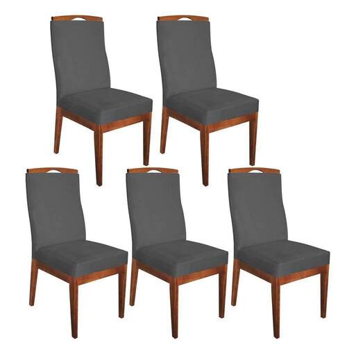 Conjunto 05 Cadeiras Para Sala De Jantar Ricco Estofada Madeira Carvalho Veludo Cinza Chumbo Escuro - Ahazzo Móveis Cor Cinza