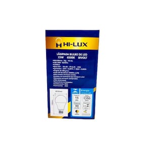 05 - LÂMPADAS LED BULBO 15W 6500KA linha de lâmpadas LED HILUX é indicada para retrofit de lâmpadas incandescentes ou fluorescentes, em diversos tipos de aplicações para ambientes internos.PROPRIEDADES¿ Lâmpadas certificadas pelo INMETRO.¿ Formato similar às lâmpadas incandescentes tradicionais.¿ Corpo em policarbonato branco e difusor em policarbonato branco leitoso.¿ Possui driver interno isolado.CARACTERÍSTICAS DE FUNCIONAMENTO¿ Temperatura ambiente: -5°C a 40°C.¿ Tensão de entrada: 100V a 240V.ESPECIFICAÇÕES TÉCNICAS¿ Base : E27¿ Tensão : Bivolt Automático 100V - 240V¿ Ângulo de abertura : 180 graus¿ Potência : 15W¿ Fluxo Luminoso : 1350 Lumens¿ Temperatura de cor : 6500K¿ Emissão de cor : Branca¿ Equivalência : Incandescente 75w / Fluorescente 20W¿ Dimensões : 108mm x 60mm