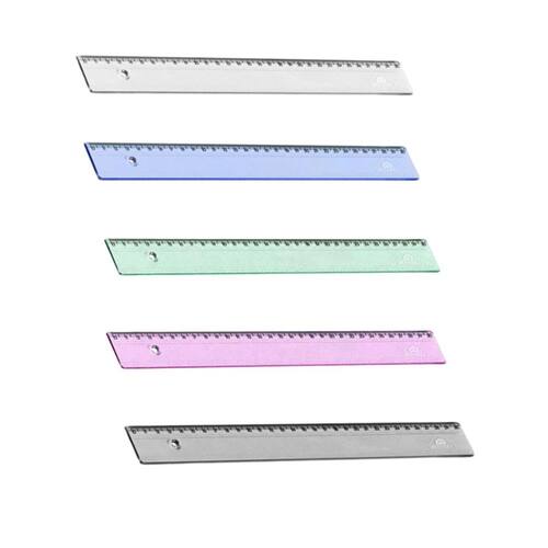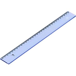 Régua em poliestireno, com escala de 30 cm gravada por transferência de imagem, garantindo alta precisão. Possui dois micro ressaltos na face que entra em contato com o papel para evitar o desgaste da escala. Cantos arredondados.